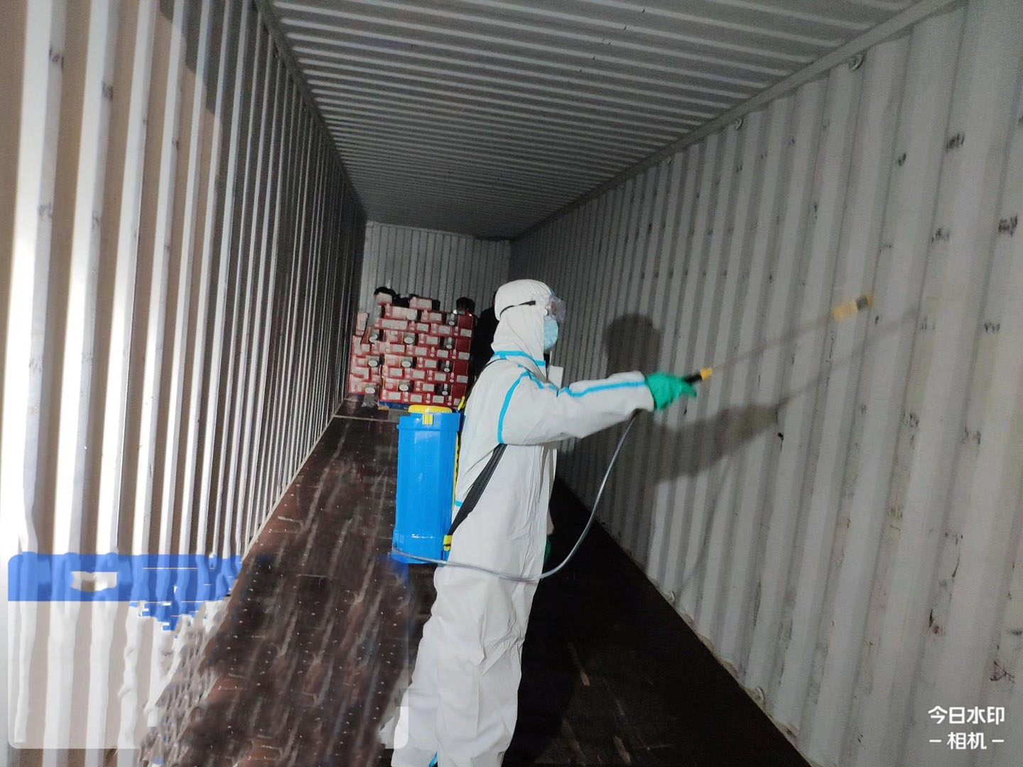 2.3对集装箱内壁各个表面进行消毒,使用1%~3%过氧化氢或有效氯500~1000mg/L的含氯消毒剂对集装箱内壁进行喷洒消毒,消毒作用时间30分钟,消毒后用清水擦拭或冲洗去除消毒剂残留。