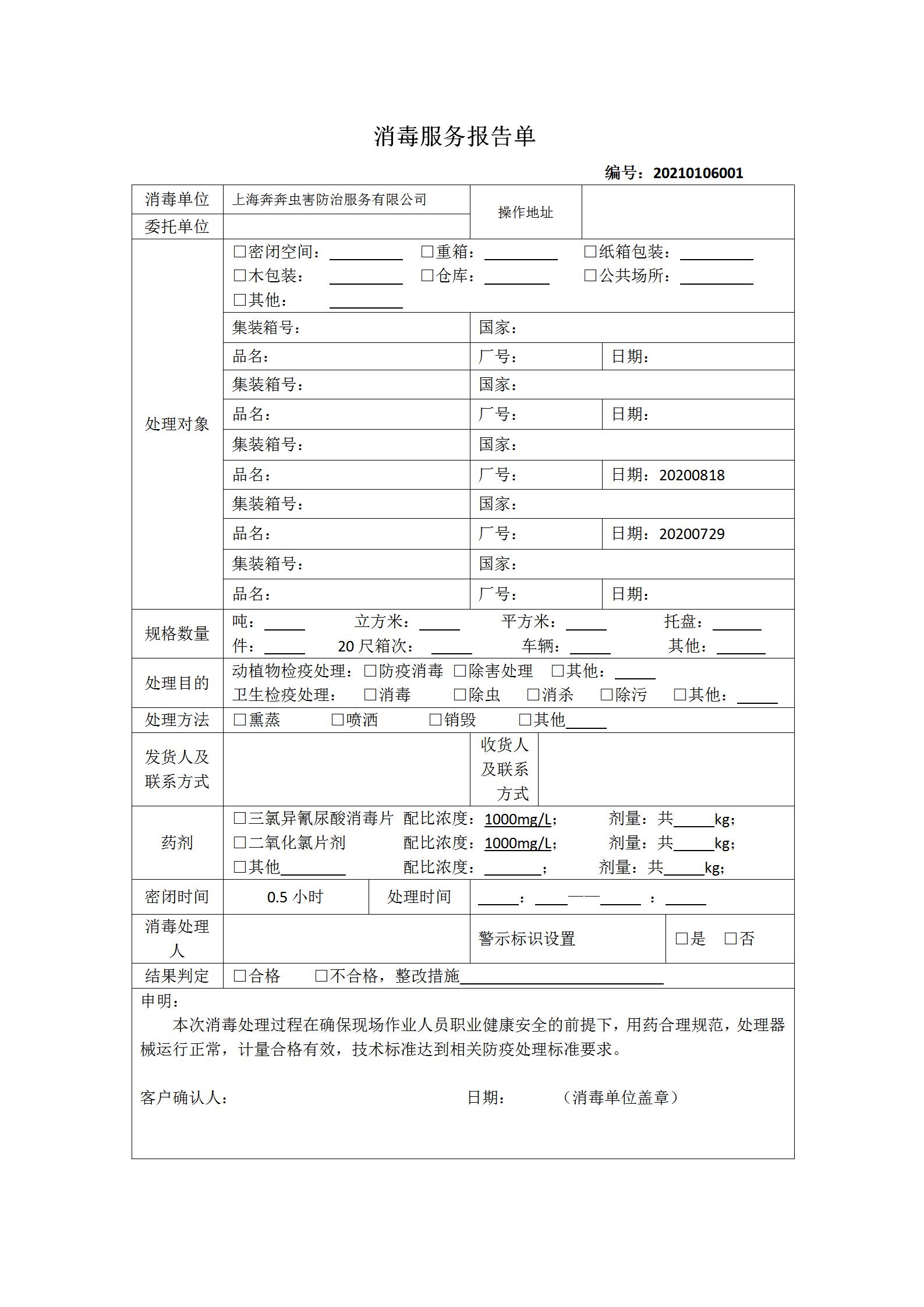 4.针对消毒过的货物填写消毒服务报告单并签字盖章,如下图: