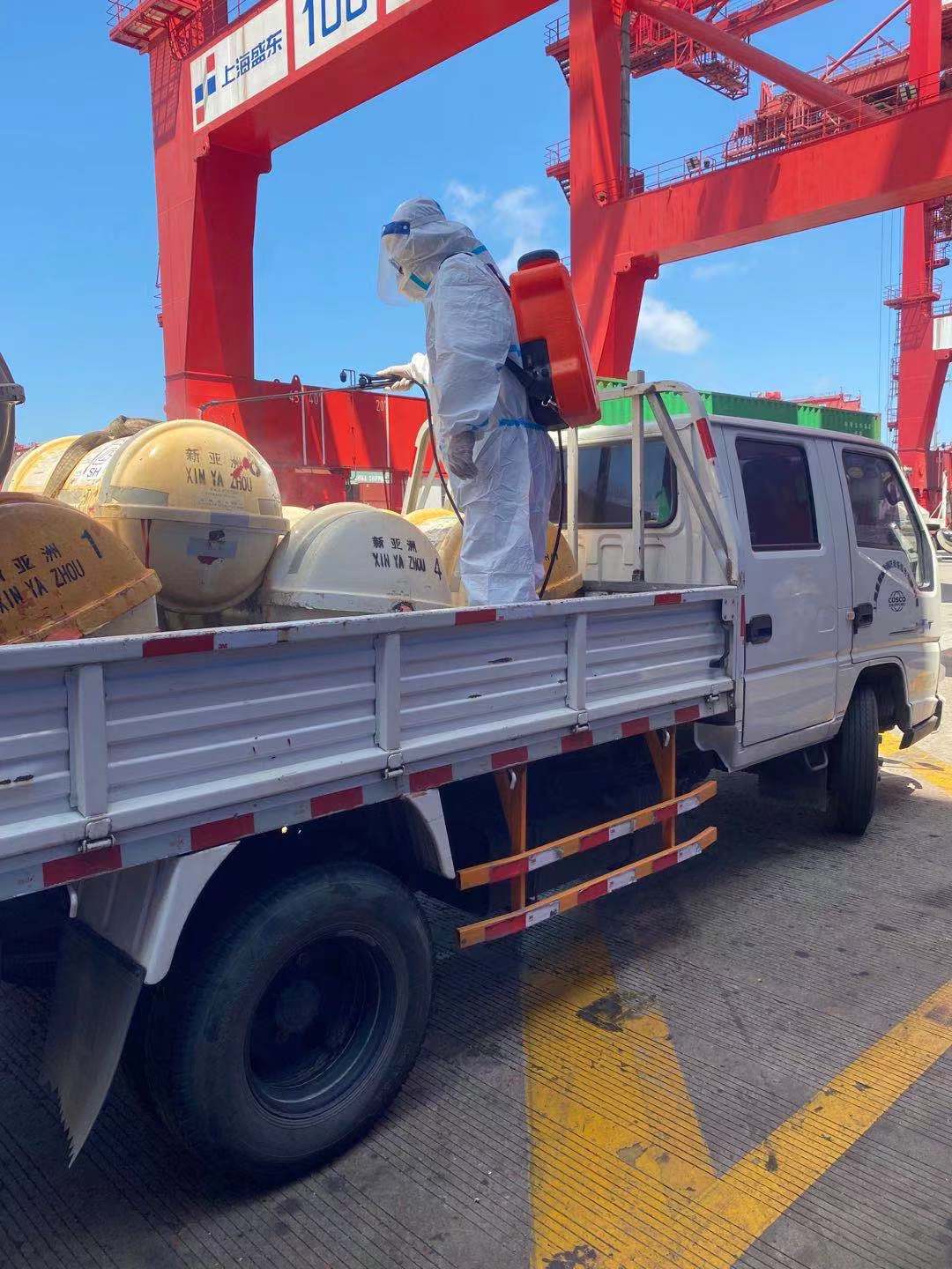 洋山深水港码头一万八千箱装特大号货轮救生设备回检消毒施工